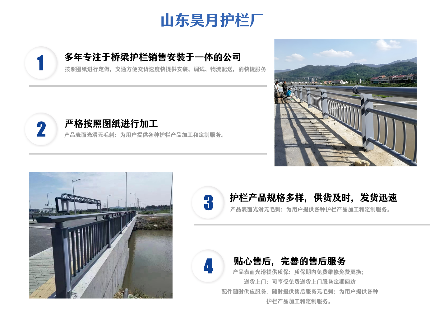 山東昊月金屬制品有限公司坐落于原材料豐富人文和諧交通發(fā)達及有“江北水城”之稱——聊城。 公司以科技興廠為宗旨,積極引進人才和技術(shù),不斷開拓創(chuàng)新. 主營產(chǎn)品:SS級橋梁防撞護欄,不銹鋼復合管護欄,鋁合金護欄,燈光護欄,河道護欄等等。產(chǎn)品本公司建立了一套科學的行之有效的質(zhì)量體系,擁有一支高技術(shù)、高素質(zhì)團隊,堅持以“誠信”為本,堅持“優(yōu)質(zhì)的質(zhì)量、貼心的服務(wù)”為崇高理念,為用戶提供質(zhì)優(yōu)價廉的產(chǎn)品提供至真至誠的服務(wù)。與客戶合作雙贏、攜手共創(chuàng)輝煌。 公司以科學的工藝、嚴格的質(zhì)量管理、完善的服務(wù)理念、合理的銷售價格贏得了良好的聲譽,建立了密切和愉快的合作關(guān)系。多年來,我們一直以良好的品質(zhì)、合理的價格,完善的質(zhì)量保障體系,完善的售后服務(wù)為客戶提供周到的服務(wù),滿足廣大客戶的需求。 我們以信譽求生存,以質(zhì)量去競爭,以真誠換合作,以效益求發(fā)展,是我們的服務(wù)宗旨。我們積極主動與同行加強交流與時俱進,邁向新的歷程!我們竭誠歡迎您的咨詢和洽談,愿與同行業(yè)的同胞們合作共贏。...